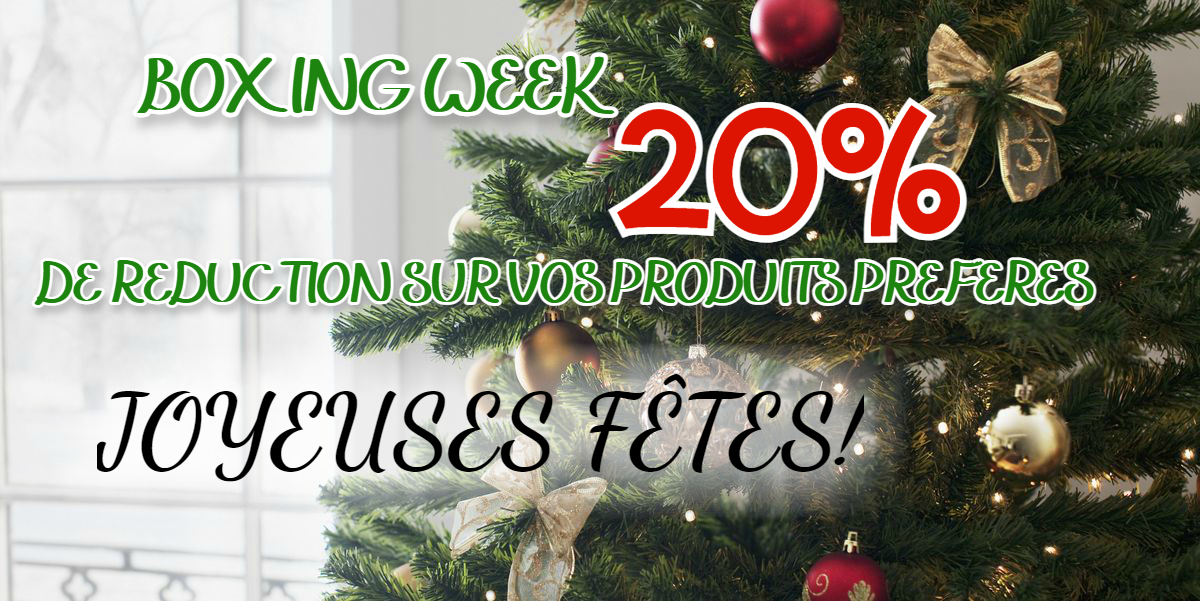 Pour la semaine du Boxing Week (26 décembre au 3 janvier), profitez d'une réduction de 20% de rabais sur tous nos produits, à l'exception des outils.